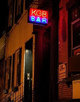Jackpot. The Asian girl paused, tapped her chin, looked at her friend: tall guy, racially ambiguous, you know, brown-ish. “I know that name,” she mused. “KGB? I’m preeeety sure I had a birthday there once,” he confessed. “But I’m not sure--” “Let’s look it up,” the girl announced, whipping her iPhone out with a flourish. A short white man in a quirky hat was either hyper or more intoxicated than the others. “KGB, beegee, see-be-jeebies. That place...closed down...”