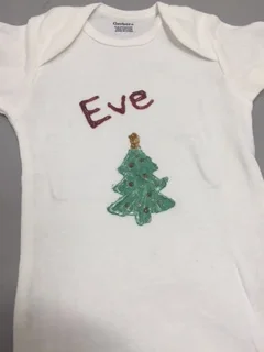 I strapped Eve back into her carrier so we could design her Christmas onesie. Most of the glitter glue was gone but we made do with what we had. She sat patiently while I kneeled on the floor, painstakingly tracing a tree onto the white cotton, dotting it with gold and silver baubles, a misshapen gold star on top. I inscribed her name in red and briefly agonized over other decorations to add before deciding simple was best. I wanted to put a candy cane over the butt, but the logistics, considering the very wet glitter on the front, seemed needlessly difficult. We left it to dry and continued to socialize. Other parents are very easy to talk to, because you can revert to baby talk and inane birthing details when you run out of things to say.